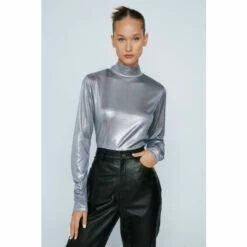 NastyGal Petite Wetlook Long Sleeve Funnel Neck Top For Female