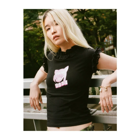 Graphic dreams. Our anime graphic t-shirt features a cute lace trim and slightly cropped length. Anime Graphic Lace Trim T-Shirt Anime T-shirt Graphic T Shirt Lace Trim Short Sleeves High Neck Model wears a size M (US size 6/UK size 10).