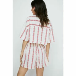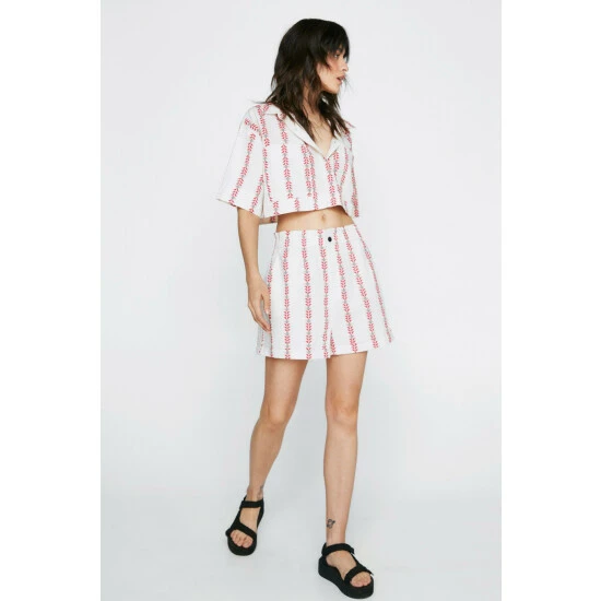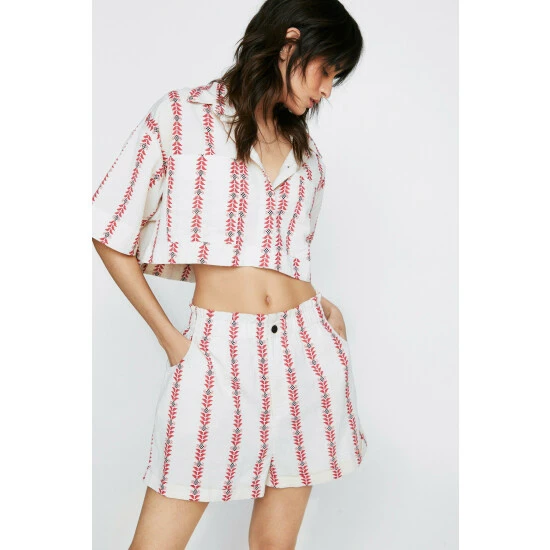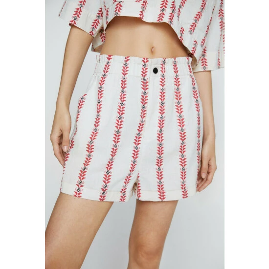 It takes two. Complete the look and style with the matching cropped shirt. Aztec Striped Paperbag Waist Shorts Loose Fit Silhouette Cropped Length High Waistband Zip Fly Closure Pockets at SidesAztec Print Throughout Model wears a size M (US size 6/UK size 10). The Boohoo Group are members of Better Cotton. By choosing our cotton products, you’re supporting Boohoo Groups investment in Better Cotton’s mission. This product is sourced via a system of mass balance and therefore may not contain Better Cotton. Learn more at Better Cotton. Find out more about our sustainability guidelines and goals.