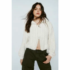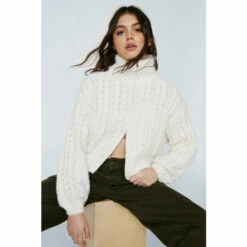 Layer weather. Feel cozy in our cable knit bomber jacket with cropped zip detailing, perfect for winter strolls and grabbing coffee. Cable Bomber Zip Up Jacket Bomber Jacket Knit Jacket Roll Neck Zip Fastening Cropped Zip Relaxed Fit Model wears a size M (US size 6/UK size 10).