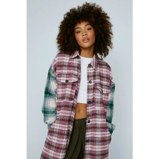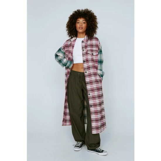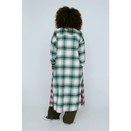 From your 9am seminar through those 6pm cocktails, and everything in between. This shirt jacket comes in flannel and features a pointed collar, relaxed, maxi silhouette, button down closure, long, drop sleeves, cuffs with button closures, splits at sides, and contrasting, two tone check print throughout. Rock yours with straight leg jeans, basic t-shirt and chunky biker boots. Style: Contrast Checked Maxi Shirt Jacket Fit: OversizedSleeve Length: Long SleevesOccasion: Day to nightDesign: Check PrintFabric: Woven