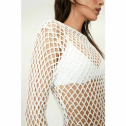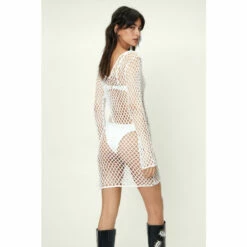 A moment for the dress. Style yours over your favorite bikini and style with knee high cowboy boots. Crochet Long Sleeved Mini Dress Loose Fit Silhouette Mini Length Boat Neckline Transitional Long Sleeves Stretch Fit Crochet Design Model wears a size M (US size 6/UK size 10).