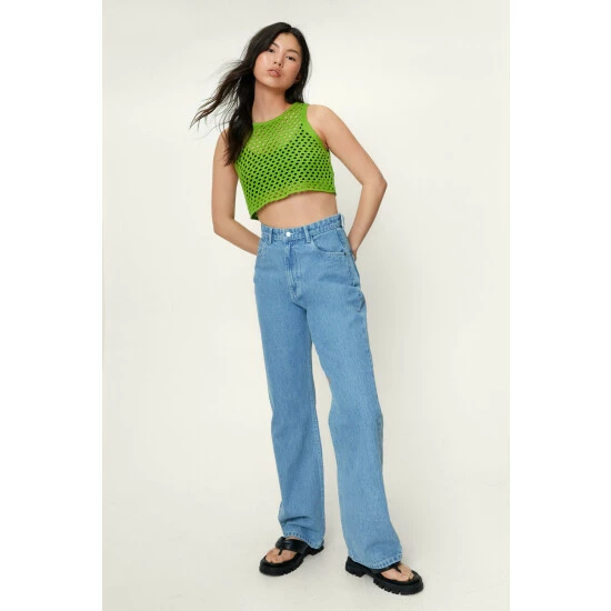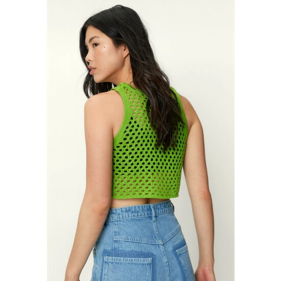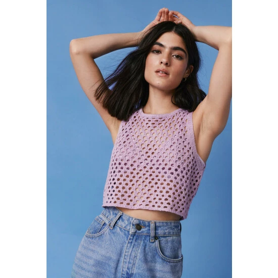 Summer staples. Style yours over a triangle bralette and low rise cargo pants. Crochet Mesh Racerback Crop Top Comfortable Loose Fit Silhouette Cropped Length Classic Crew Neckline Sleeveless Design Raw Hem Crochet Design Model wears a size M (US size 6/UK size 10).”