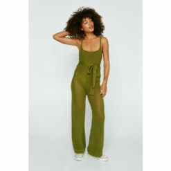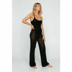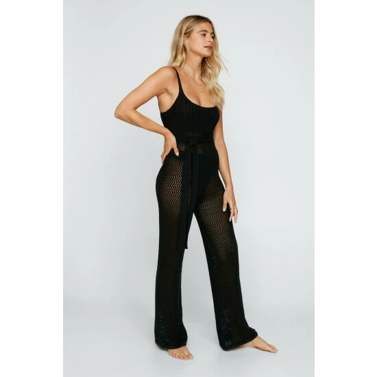 Style: Wide Leg JumpsuitDesign: PlainFabric: CrochetLength: RegularNeckline: ScoopSleeve Length: Strappy