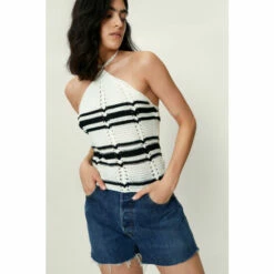 Get on top. Style yours with denim shorts and flatform sandals. Crochet Stripe Halter Neck Top Figure Flattering Silhouette Longline Silhouette Halterneck Bow Tie Closure Crochet Fabric Stripe Design Model wears size M (US size 6/UK size 10).