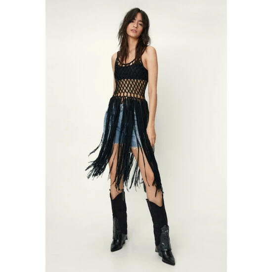 Make moves.Oversized fringing to see you through all your summer plans. Pair with some cowboy boots, denim shorts, and a bandeau. Crochet Knitted Tassel Hem Top Crochet Knit Design Loose Fit Silhouette Scoop Neckline Sleeveless Long Fringed Detailing at Hem Model wears a US size 6/UK size 10.