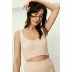Cute apart and great together. Style with the matching chunky knit mini skirt and lace up biker boots. Cropped Knit Fluffy Bralette Figure-Flattering Silhouette Cropped Length Sleeveless Design V Neckline Stretch Fit Fluffy Knit Model wears a size M (US size 6/UK size 10).