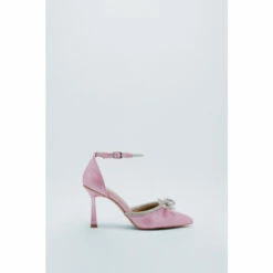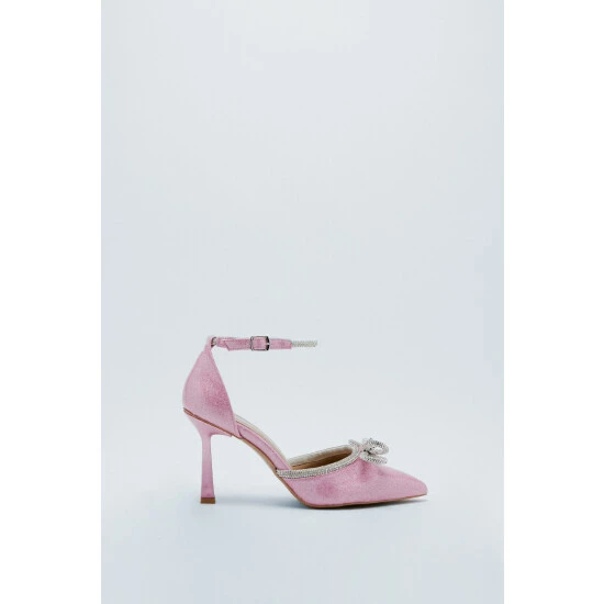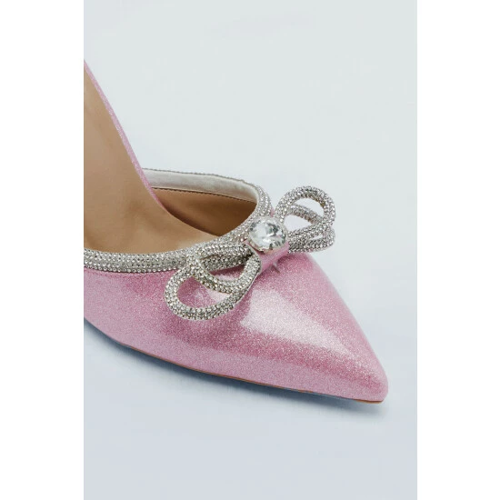 Steps that sparkle. These shoes feature pointed toes, enclosed heels, and diamante trim details. Team with a equally statement two-piece for a playful night out look. Diamante Trim Glitter Court Heels Enclosed Toes Slim Flared Heels Court Design Bow Accent on Front Adjustable Ankle Strap Rectangular Frame Buckle Punch Hole Closures All-Over Glitter Details High-Shine Patent Material Metallic Effect Hardware