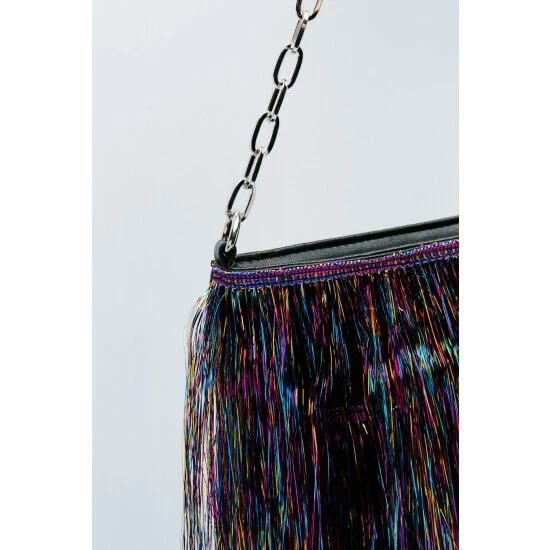 Party time. Add a pop of sparkle to your look with our tassel party bag, perfect for holding your night out essentials. Extreme Tassel Shoulder Party Bag Shoulder Bag Tassel Detailing Zip Fastening Chain Strap Tiered Tassel Design