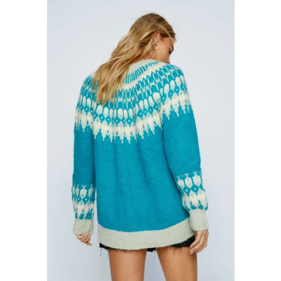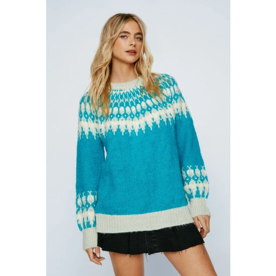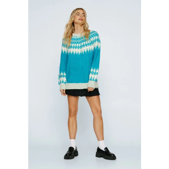 Sweater season. Get cozy in our fairisle patterned sweater. Pairs well with mulled wine and cozy nights in. Fairisle Trim Sweater Fairisle Pattern Cuffed Sleeves Relaxed Fit Oversized Sweater Model wears a size M (US size 6/UK size 10).