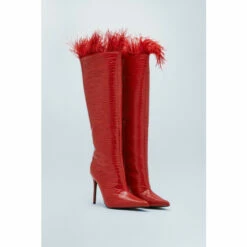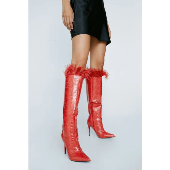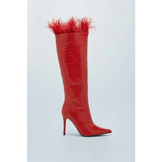 Wild thing. Make your footwear a focal point in our iconic feather trim knee high boots. Faux Croc Feather Trim Knee High Boots Faux Croc Boots Knee High Boots Stiletto Heeled Boots Feather Trim Feature Croc Textured Boots Inner Ankle Zip Fastening Pointed Toes Stiletto Heels