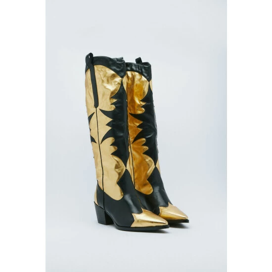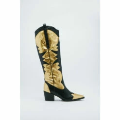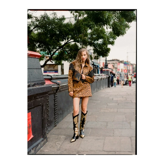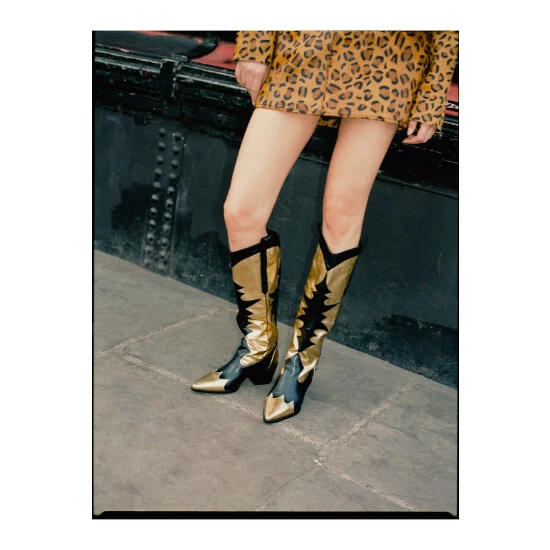 The third leg: London. Led by stylist and all-round cool girl, Alex Pantano, she sees style as an opportunity to build off your personality and stand out from the rest. Follow us as she tells the story of her city through her eyes, and where we discover influences for our third collection-a mix of trophy outer layers, leather textures, and statement evening pieces inspired by London’s bold and creative culture, and the individualism that embodies the city. Dance the night away. Knee length black and gold cowboy boots to catch anyone’s attention. Pointed Toe Cowboy Boots Metallic Gold Detailing Knee Length Cowboy Boots Statement Boots, Perfect for Nights Outs or Strutting Around Town