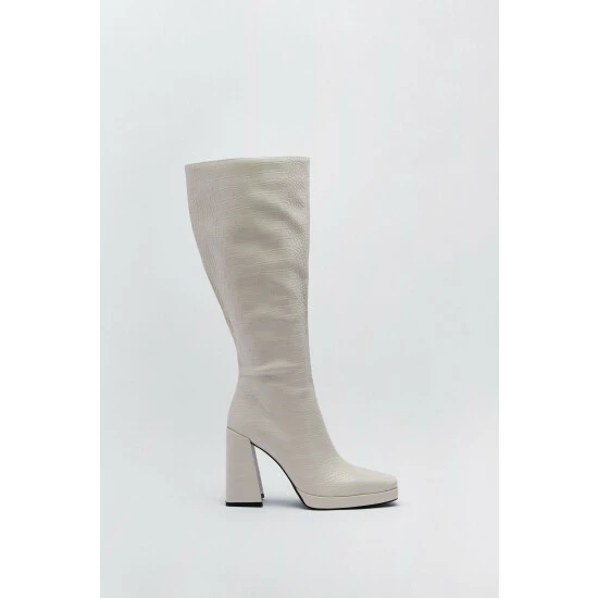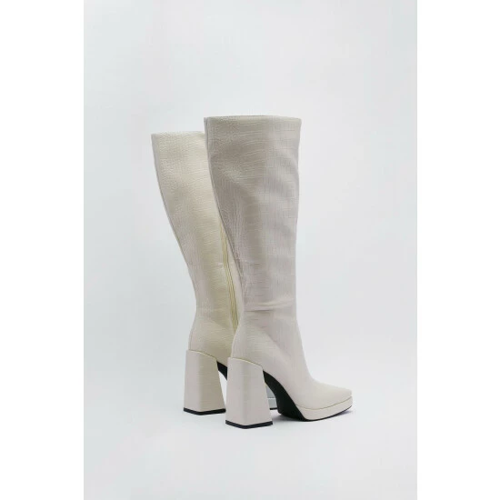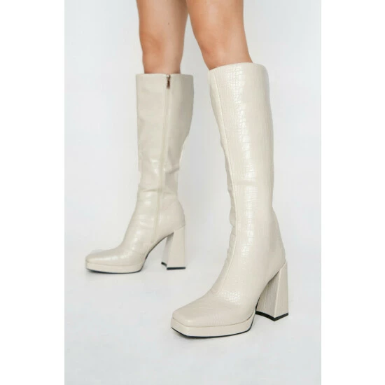 Walk on over. These boots feature pointed square toes, flared chunky heels, and side zip closures. Team with a cargo skirt and motocross jacket for a playful outfit. Faux Leather Effect Knee High Boots Knee Height All-Over Crocodile Effect Faux Leather Material Metallic Effect Hardware Total Heel Height: 10cm/4″