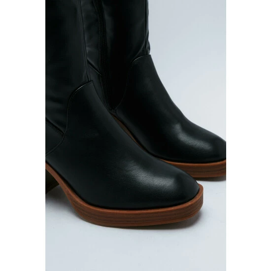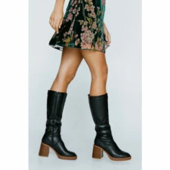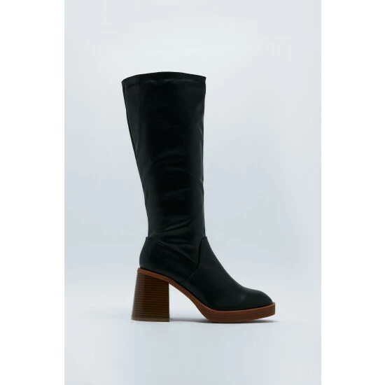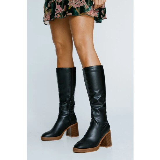 Made for walking. Style our faux leather platform knee high boots with a mini dress or jeans for interseasonal wear. Faux Leather Platform Knee High Boots Faux Leather Boots Knee High Boots Platform Boots Inner Leg Zip Fastening Wood Effect Heels Chunky Heels
