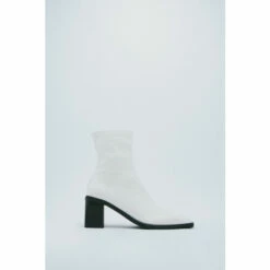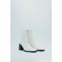 Keep on walking. These boots feature square toes, block heels, and a slim-fitting style. Pair with cropped denim jeans and oversized knitwear for an elevated, off-duty outfit. Faux Leather Square Toe Ankle Sock Boots Ankle Height Zip Closures on Side Sock Design Metallic Effect Hardware Faux Leather Material Seam Details Low Heels
