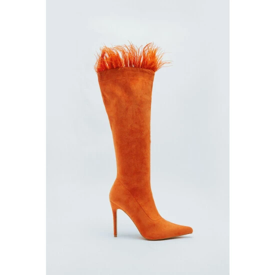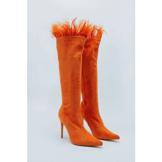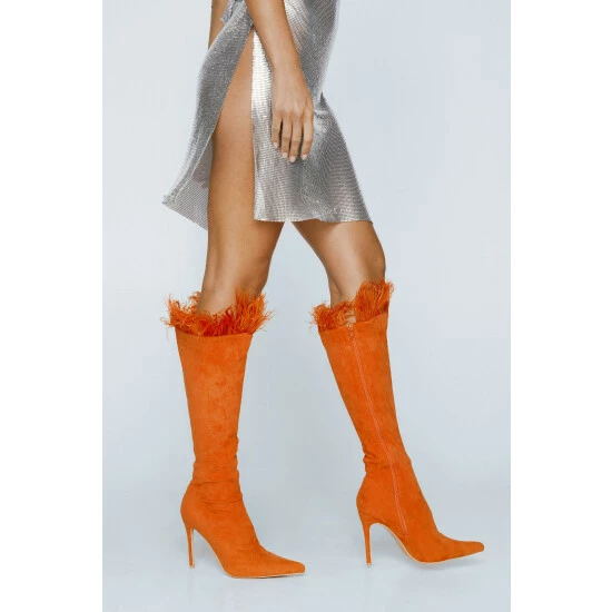 Strut it. Feel glamorous in our knee high boots, made in high quality faux suede, featuringstatement pointed toes and stiletto heels, and a fun feather trim. Pairs well with mini dresses and skirts for footwear that will take you from happy hour to cocktail bars to dancefloors. Faux Suede Feather Trim Knee High Boots High Quality Faux Suede Statement Stiletto Heels Iconic Pointed Toes Fun Feather Trim Inner Leg Zip Fastening