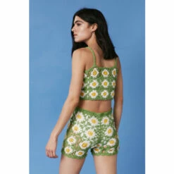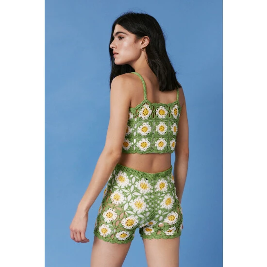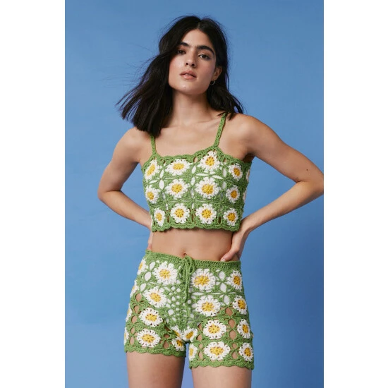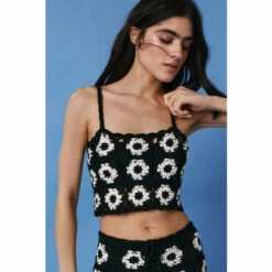 Style: Knitted Co-Ord TopDesign: FloralFabric: CrochetLength: CroppedNeckline: SquareSleeve Length: Strappy