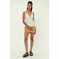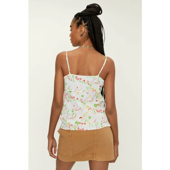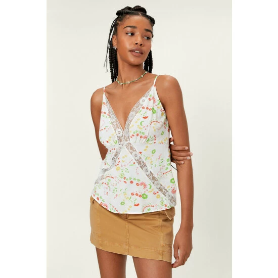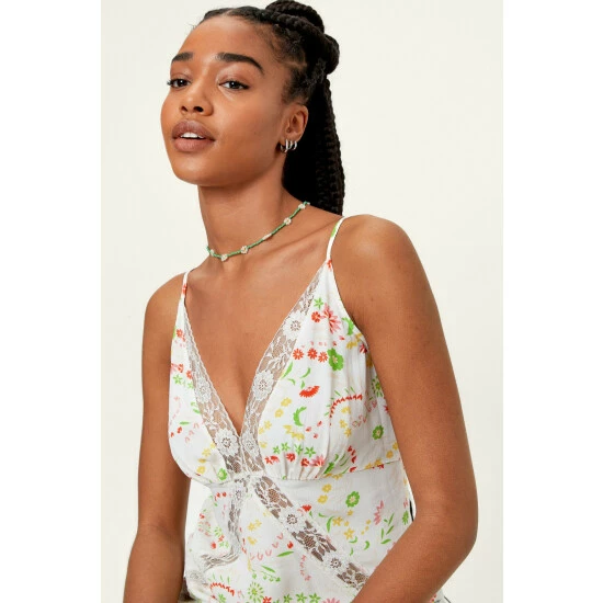 Feeling floral. Style with a denim mini skirt, and chunky sandals. Floral Print Lace Insert Cami Top Cami Top Regular Fit Lace Trim Details Insert Accents V-Neckline Ruched Details Under Bust Thin Adjustable Straps Satin Fabric All-Over Floral Print Model wears size M (US size 6/UK size 10).