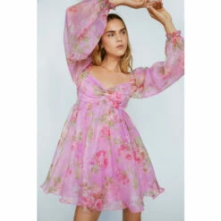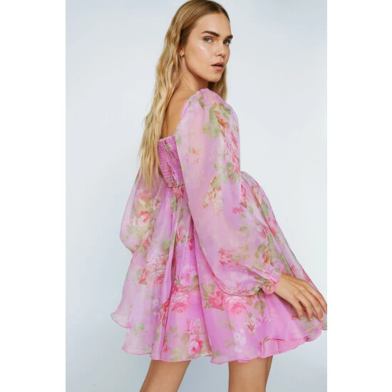 Style: Skater DressDesign: FloralFabric: OrganzaLength: MiniNeckline: BardotSleeve Length: Long Sleeve