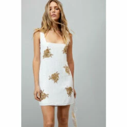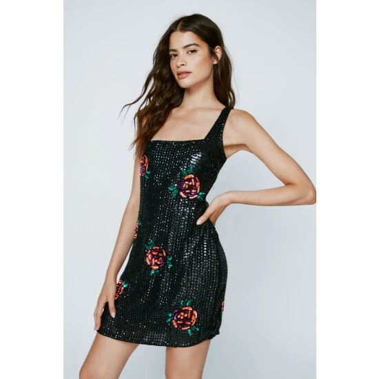 A moment for the dress. Feel fancy in our bridal sequin dress, perfect for any of the many celebrations leading up to the big day. The mini dress features sequin detailing that catches the light and the universally flattering square neckline looks amazing on everyone. The straight design clings to your curves in the best way, and the dress can easily be styled with chunky heels. Floral Sequin Square Neck Mini Dress Bridal Mini Dress Sequin Fabric Square Neckline Floral Accent Figure Hugging Design Model wears a size M (US size 6/UK size 10).