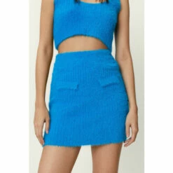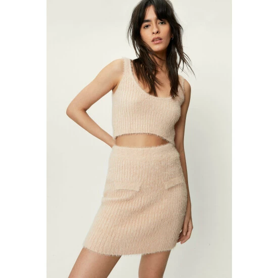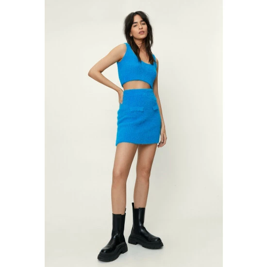 Cute but comfy. Complete the look and style with that matching crop top and chunky biker boots. Fluffy Knit Mini Skirt Bodycon Figure-Flattering Silhouette Mini Length High Waisted Design Flap Pockets at Front Elasticized Waist Ribbed Knit Stretch Fit Model wears a size M (US size 6/UK size 10).