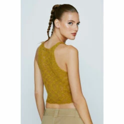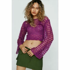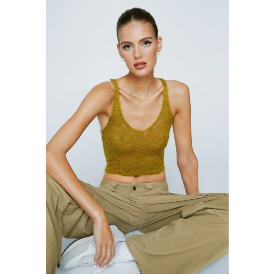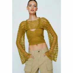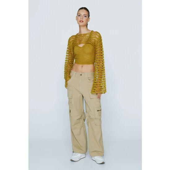 Crochet all day. Style our racer back crop top with the matching cropped sweater and cargo pants for a cozy cold weather outfit. Crochet Racer Crop Top Racerback Top Crochet Top Deep V Neckline Cropped Length Matching Sweater Sold Separately Model wears a size M (US size 6/UK size 10).