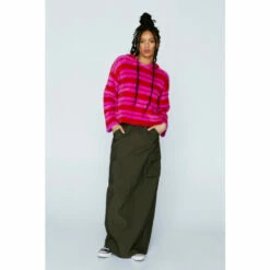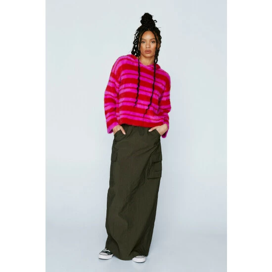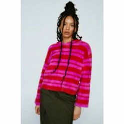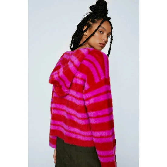 Layer season. Feel cozy in our knit sweater, with high quality knit fabric, a comfortable relaxed design, and a brightly coloredstripe pattern. Pairs well with jeans or mini skirts for the perfect casual day out look, or with leggings for a more pared down, lazy day look. Perfect for wearing to coffee catch ups and brunch dates. Hooded Stripe Brushed Knit Sweater High Quality Knit Fabric Colorful Stripe Pattern Soft, Fuzzy Fabric Comfortable Relaxed Design Hood Feature Model wears a size M (US size 6/UK size 10).