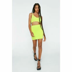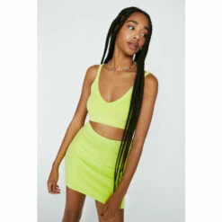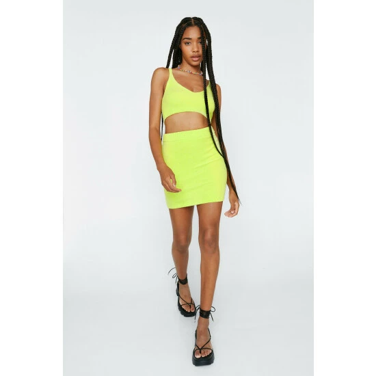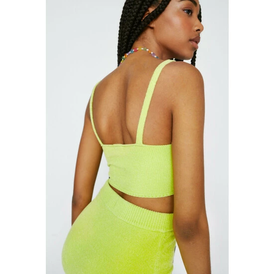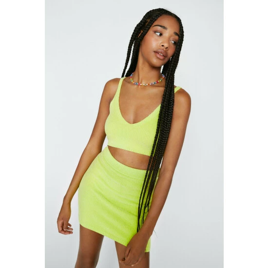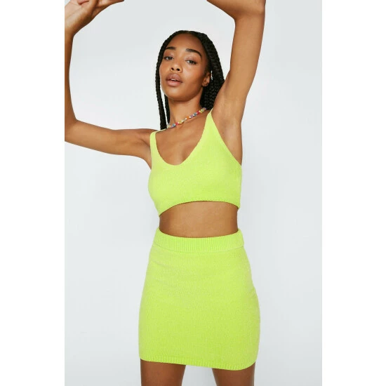 Knit takes two. Complete the look and style with the matching mini skirt. Pair with platform sandals. Knitted Chenille Bralette Fitted Silhouette Cropped Length Scoop Neckline Sleeveless Design Knitted Chenille Stretch Fit Model wears size M (US size 6/UK size 10).