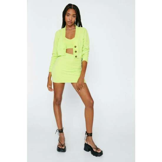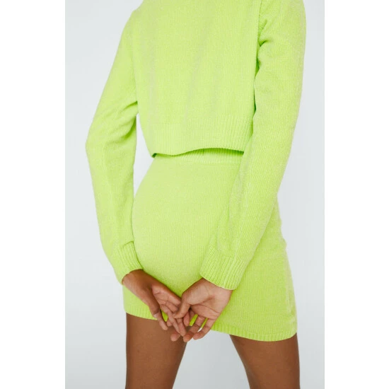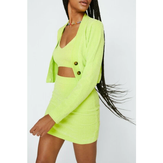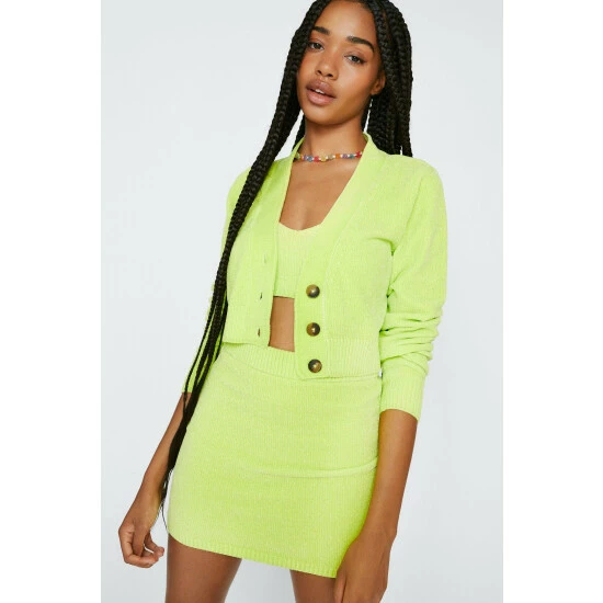 For cooler evenings. Complete the look, and pair with matching crop top, and mini skirt. Knitted Chenille Cropped Cardigan Regular Fit Long Sleeves Cropped Length Button Down Closures on Front Tortoiseshell Effect Buttons Ribbed Cuffs and Hemline Knitted Design Lightweight Chenille Fabric Model wears size M (US size 6/UK size 10).