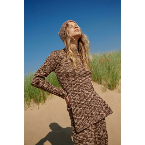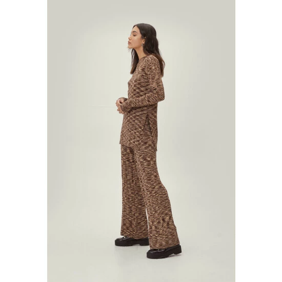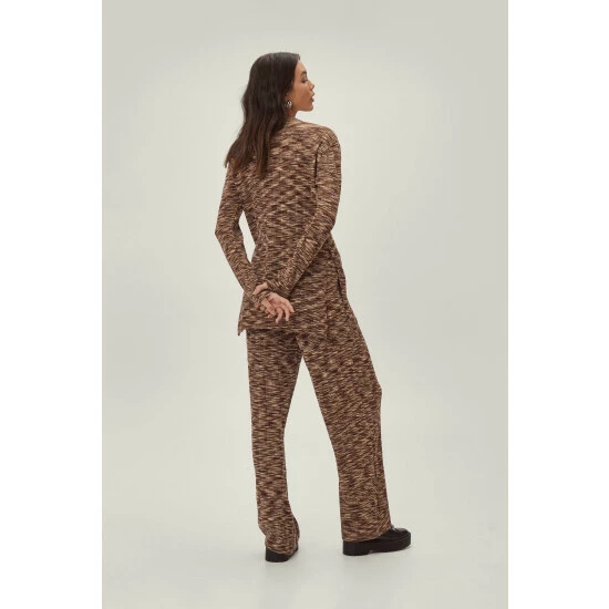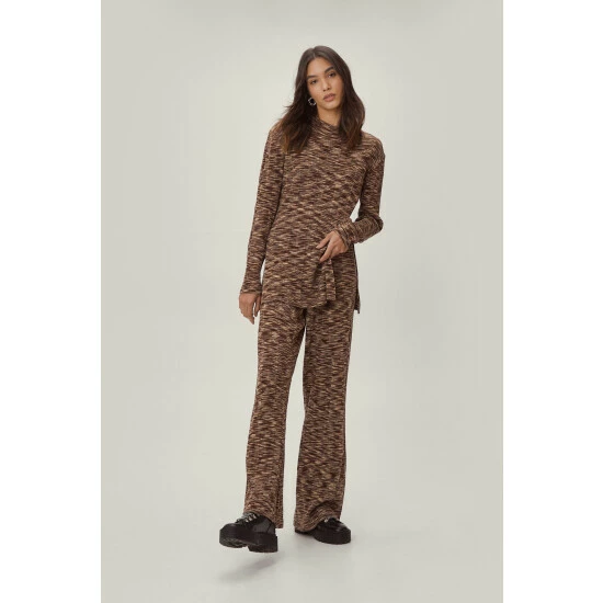 Kitted out in knit. This top and pants set comes in soft knit. The top features a figure-skimming, longline silhouette, high turtleneck, long sleeves, double split hemline, and abstract stripe print throughout. The matching pants feature an elasticated high waist, relaxed wide leg silhouette, pull-on style, and abstract stripe print throughout. Double up on pleasure and wear your set together. Style: Knitted Striped Split Side Turtleneck Top and Pants Set Fit: Relaxed Length: Full Length Occasion: Casual Design: Striped Model is 5’8″ and wears a size M (US size 6/UK size 10).