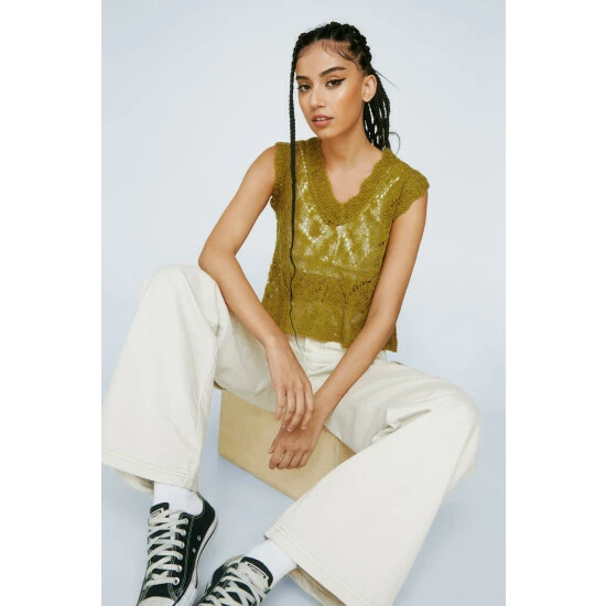 Cute top. Style our lace ladder stitch knitted tank with leather bottoms and chunky boots. Lace Ladder Stitch Knitted Tank Knitted Tank Top Sheer Tank Top V Neck Relaxed Fit Lace Top Model wears a size M (US size 6/UK size 10).