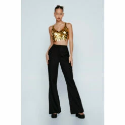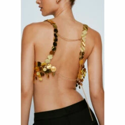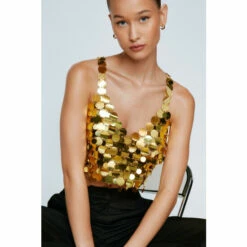 Be a human disco ball. Our chainmail cami top looks great with black flare pants or leather pants and chunky heels. Layered Disc Chainmail Cami Top Chainmail Top Cami Top V Neckline Cropped Length Chain Fastening in Back Reflective Disc Material Model wears a size M (US size 6/UK size 10).