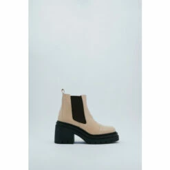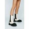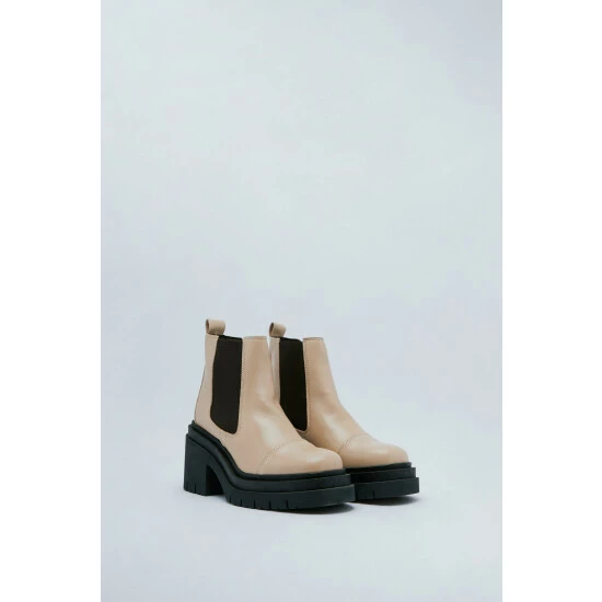 Bet your boots. These boots feature rounded toes, cleated soles, and a chunky design. Team with a mini skirt and an oversized blazer for a preppy ensemble. Leather Chunky Chelsea Boots Ankle Height Tabs on Back Elasticized Panels Real Leather Material Seam Details