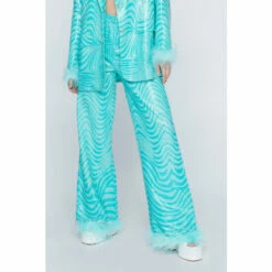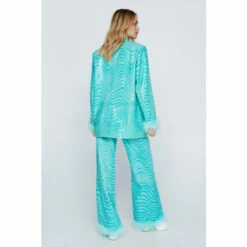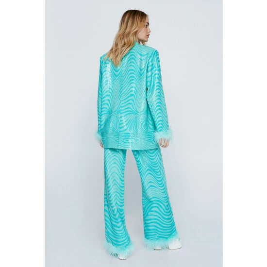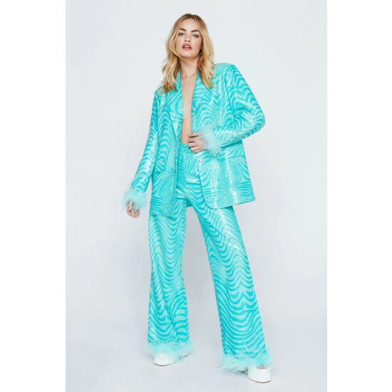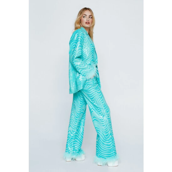 Down here. Feel party ready in our wide leg pants, made in high quality sequin fabric, with an ultra flattering wide leg fit, a fun and flirty feather trim, and an enchanting marble pattern. Pairs well with the matching blazer and heels for an elevated occasion look that will take you seamlessly from drinks to dancefloors. Tailored Marble Feather Trim Pants High Quality Sequin Fabric Hypnotising Marble Pattern Flattering Wide Leg Fit Flirty Feather Trim Comfortable High Waist Model wears a size M (US size 6/UK size 10).