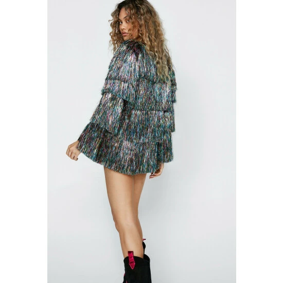 Party crasher. Great for styling with the matching fringed mini skirt. Fringed Long Sleeve Multi Tinsel Jacket Loose Fit Silhouette Long Sleeve Length V Neckline Open Front Metallic Fringing Throughout Model wears size M (US size 6/UK size 10).