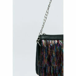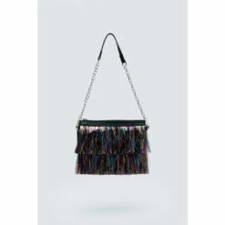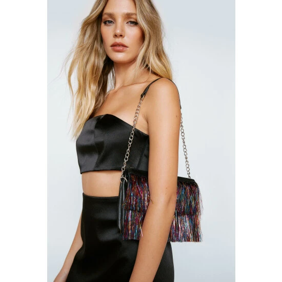 Party time. Add movement and color to your look with our fun tassel bag, perfect for holding your night out essentials. Party Crasher Tassel Bag Shoulder Bag Tassel Detailing Zip Fastening Chain Strap Tiered Tassel Design Small Handbag