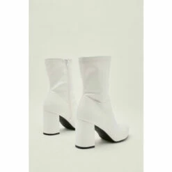 Heading out. These boots come in patent faux leather and feature a round toe, ankle design, block heel, almond toe, and inside zip closure. Style: Patent Faux Leather Block Heel Sock Boots Heel Height: Mid Block Heel Length: Ankle Occasion: Day to Night