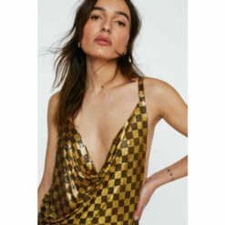 Check it out. Style with a pair of cowboy boots for a playful going out look. Petite Chainmail Checkerboard Cowl Neck Mini Dress Figure-Skimming Silhouette Mini Length Shoulder Straps Chainmail Design Metallic Effect Hardware All-Over Checkerboard Print Crossover Straps on Back Plunging Cowl Neckline Side Split Low Back Model is 5’3″ and wears size M (US size 6/UK size 10). The ultimate showpiece. Check out our full range of party dresses, perfect for the festive season.