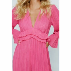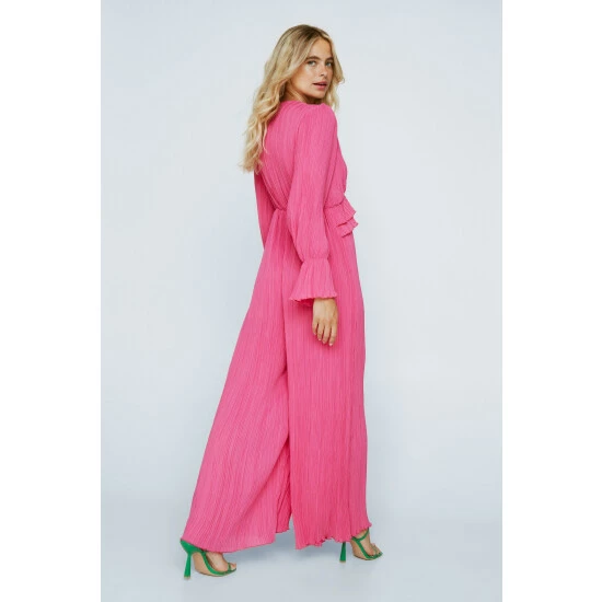 Ready for tonight. Style with strappy heels and a sparkly clutch bag for that upcoming special event. Petite Plisse Chiffon Wide Leg Jumpsuit All-in-One Design Wide Leg Silhouette Long Sleeves Relaxed Fit V-Neckline Ruffle Details Under Bust Elasticized Cuffs and Waistband Flattering Plisse Fabric Model is 5’3″ and wears size M (US size 6/UK size 10).