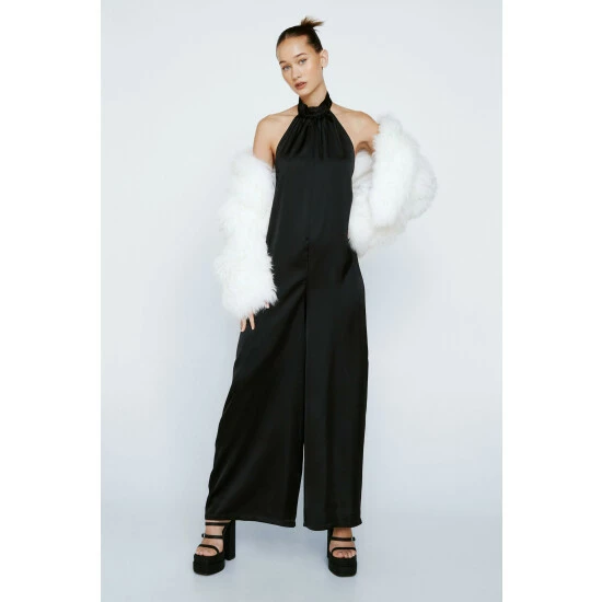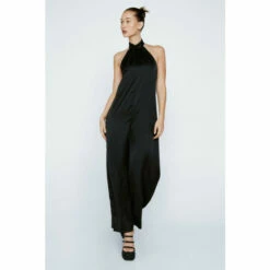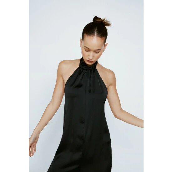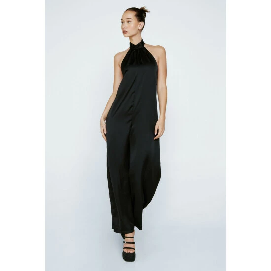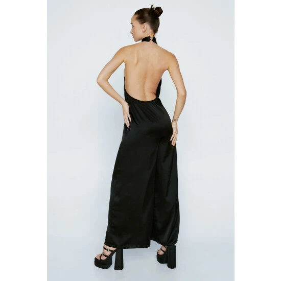 One-hit wonder. Our petite jumpsuit is perfect for any occasion, and pairs well with chunky heels and a cocktail. Petite Satin Halterneck Wide Leg Jumpsuit Satin Jumpsuit Wide Leg Jumpsuit Halterneck Structure Backless Design High Neck Button Fastening at Neck Model wears a size M (US size 6/UK size 10).