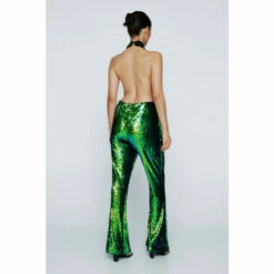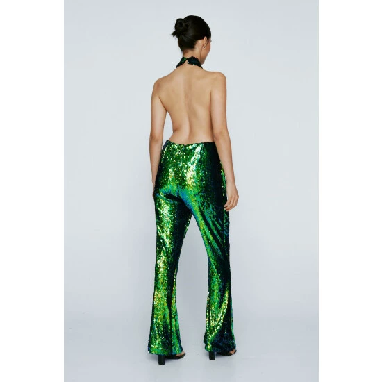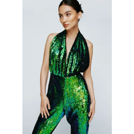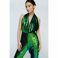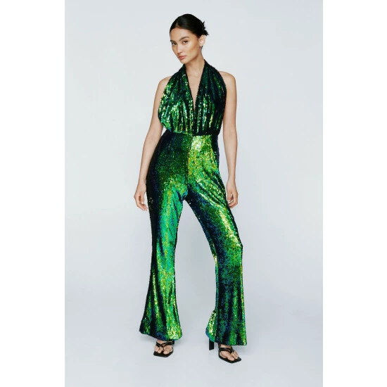 Take the plunge. Style up with block-heel sandals to take you from festival season to disco moments. Petite Sequin Halterneck Plunge Jumpsuit Fitted Silhouette Full Length Flared Legs Retro Halter Neck Buttoned Neckline Closure All-Over Sequined Fabric Model wears a US size 6/UK size 10.
