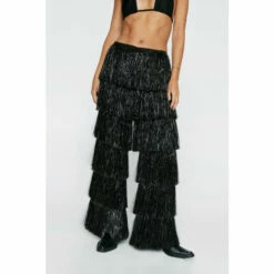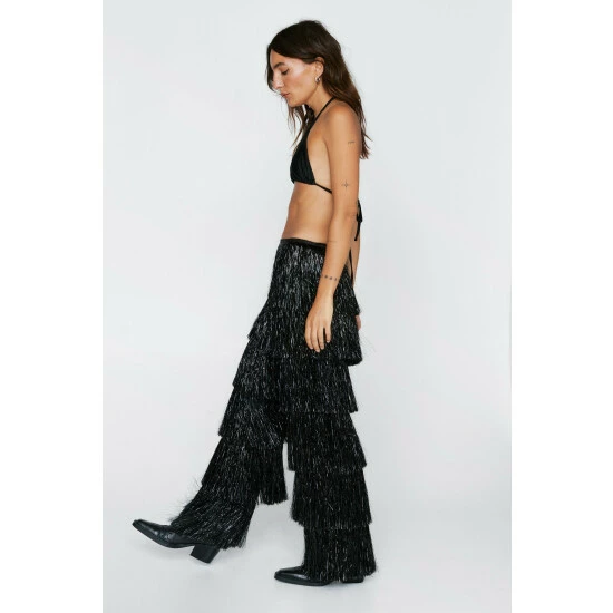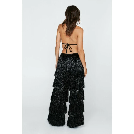Main stage memories. Style with a bralette for a festival-ready outfit. Petite Tinsel Fringed Tiered Pants Tiered Tinsel Fringing High Waisted Design Flared Style Stretchy Waistband Long Length Opaque Under Layer Comfortable Woven Fabric Model is 5’3″ and wears size M (US size 6/UK size 10). The ultimate showpiece. Check out our full range of going out outfits, perfect for the festive season.