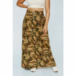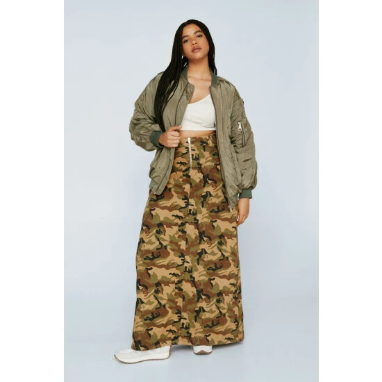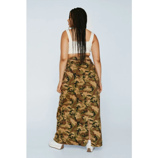 Maximise it. Our plus size maxi skirt in camo print will have you feeling super comfy while looking great. Style it with a crop top and bomber jacket for an elevated look. Plus Size Camo Printed Twill Cargo Maxi Skirt Plus Size Maxi Skirt Camoflage Print Zip Fastening Comfortable High Waist Pocket Feature Belt Loops Model wears a size L (US size 12-14/UK size 16-18).
