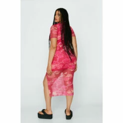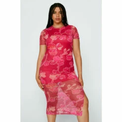 In bloom. Great to style with flatform thong sandals and a denim jacket. Plus Size Floral Print Mesh Midi Dress Figure-Hugging Silhouette Midi Length Short Sleeves Crew Neckline Side Split All-Over Floral Print Semi-Sheer Mesh Overlay Shorter Opaque Lining Stretchy Woven Fabric Model wears a size L (US size 12-14/UK size 16-18).
