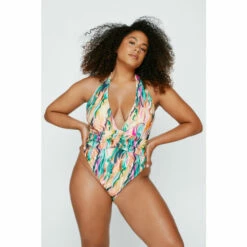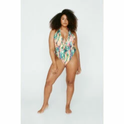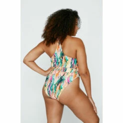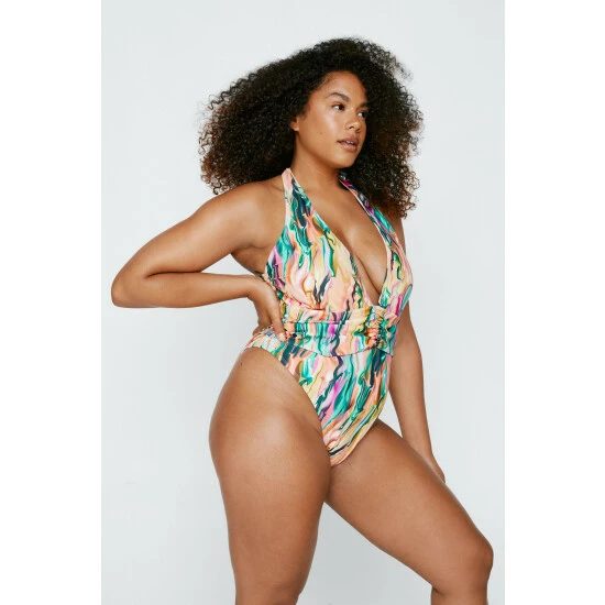 Sea breeze and martinis. All Things Considered by Nasty Gal is our collection of sustainable pieces each thoughtfully considered and crafted with the world in mind. Style with a crochet cover up, and strappy sandals. Plus Size Recycled Marble Print Swimsuit Halter Neck Design Plunging Neckline Racer Back Details Gathered Accents on Waist All-Over Marble Print High Leg Silhouette Flattering Medium Bottom Coverage Model wears a size L (US size 12-14/UK size 16-18). This garment is READY FOR THE FUTURE. It is made with recycled polyester. Find out more about our sustainability guidelines and goals.