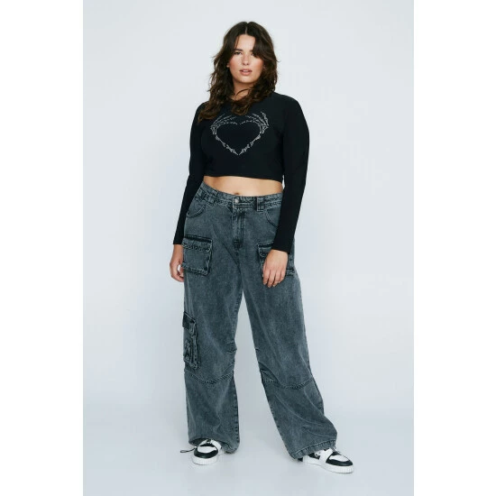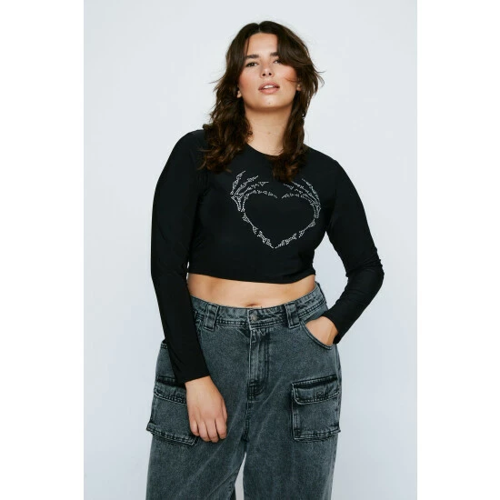 Creepin’ it real. Team with denim jeans for a spooky twist on casual style. Plus Size Skeleton Heart Long Sleeve Top Slim-Fitting Silhouette Cropped Length Long Sleeves Crew Neckline Sparkly Embellishments Skeleton Heart Design Comfortable Jersey Fabric Model wears a size L (US size 12-14/UK size 16-18).