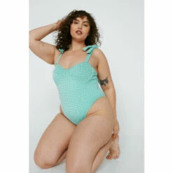 By the sea. Team with a pair of flat sandals as you head to the beach bar. Plus Size Textured Gingham Print Swimsuit All-in-One Design High Leg Silhouette Tie Shoulder Details All-Over Gingham Print Sweetheart Neckline Thick Shoulder Straps Medium Bottom Coverage Textured Fabric Model wears a size L (US size 12-14/UK size 16-18).