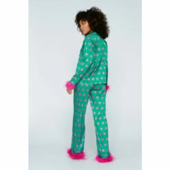 Sweet dreams. Feel luxe in our bridal pajama set, perfect for the night before the big day. The button up shirt makes it easy to change into your dress without touching your makeup or hair, and the feather trim brings the fun. Wide leg pants provide ultimate comfort to help you get some rest before the big day. Polka Dot Feather Trim Shirt & Pants PJ Set Fun Polka Dot Pattern Flirty Feather Trim Button Fastening for Easy Removal Comfortable Relaxed Fit Pants Model wears a size M (US size 6/UK size 10).