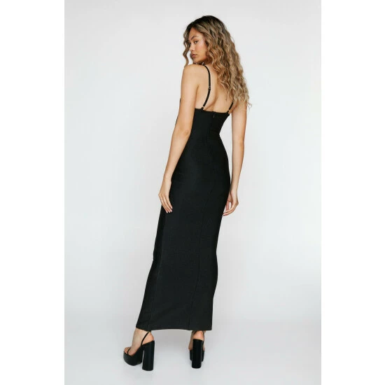 Statement maker. Goes well with a pair of heels, a clutch bag, and your go-to cocktail. Premium Cut-Out Bandage Maxi Dress Figure-Hugging Silhouette Maxi Length Stretchy Woven Fabric Slim Adjustable Shoulder Straps Deep Plunging Neckline Clear Panel Cut-Out Detail on front Concealed Zip Closure on Back Binding Accents Model wears size M (US size 6/UK size 10).