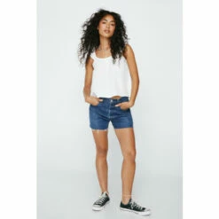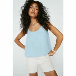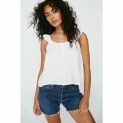 Get on top. Style yours denim shorts and canvas converse. Premium Modal Texture Gauze Swing Cami Top Loose Fit Straps with Ruffle Detailings Scoop Neck Textured Fabric Model wears size M (US size 6/UK size 10).